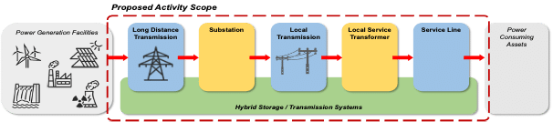 While the Electrical Engineering subject is a large one which includes the building and infrastructure built asset sectors, the purpose of this project is to focus on electrical power transmission and distribution networks and related assets between the power generation source and the service nodes of power consumption (as noted in the diagram below). The power consuming assets include any type (building, campus, infrastructure asset and/or network, etc), but not the electrical engineering inside of buildings and infrastructure assets/networks.