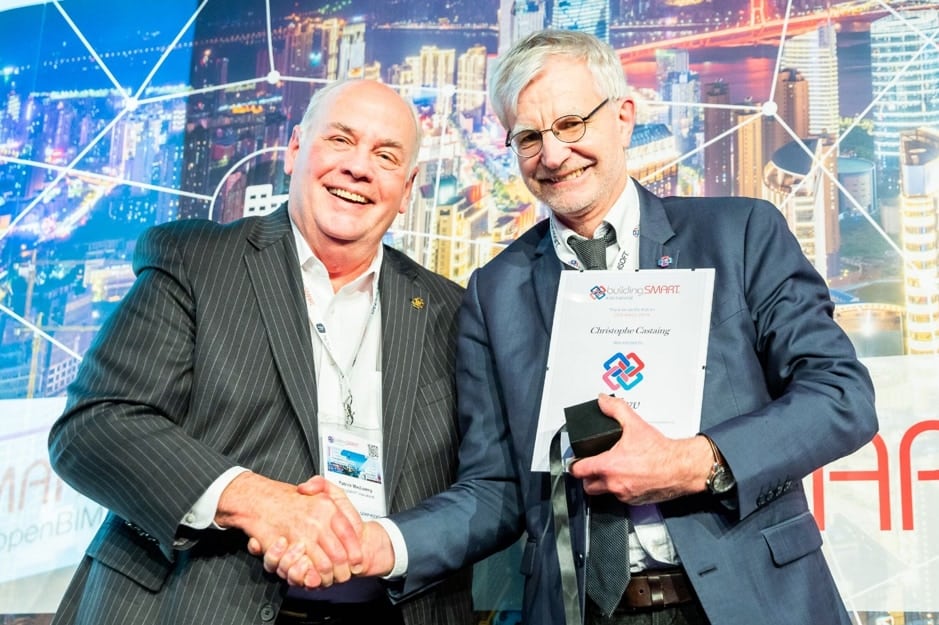 (Christophe Castaing receives a Fellows Award from Patrick MacLeamy, buildingSMART International Chairman in March 2019)