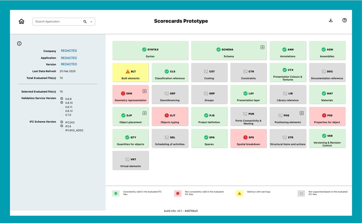 The scorecards are generated per version of a software tool. IFC uploads from software vendors are ignored when producing the scorecards. This means the score cards can only be generated for software tools that are used in practice by actual users. They are only generated when the data in the Validation Service are statistically significant.